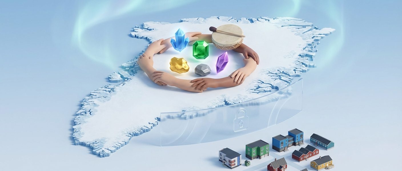Grønlands undergrund indeholder værdifulde mineraler som sjældne jordarter, uran, zink og guld. Internationale interesser presser på for udvinding, men uden lokal kontrol risikerer Grønland miljøskader, tab af kulturelt land og økonomisk udnyttelse. Bæredygtig ressourceforvaltning kræver grønlandsk selvbestemmelse, transparente aftaler og respekt for oprindelige folks rettigheder til deres territorier.